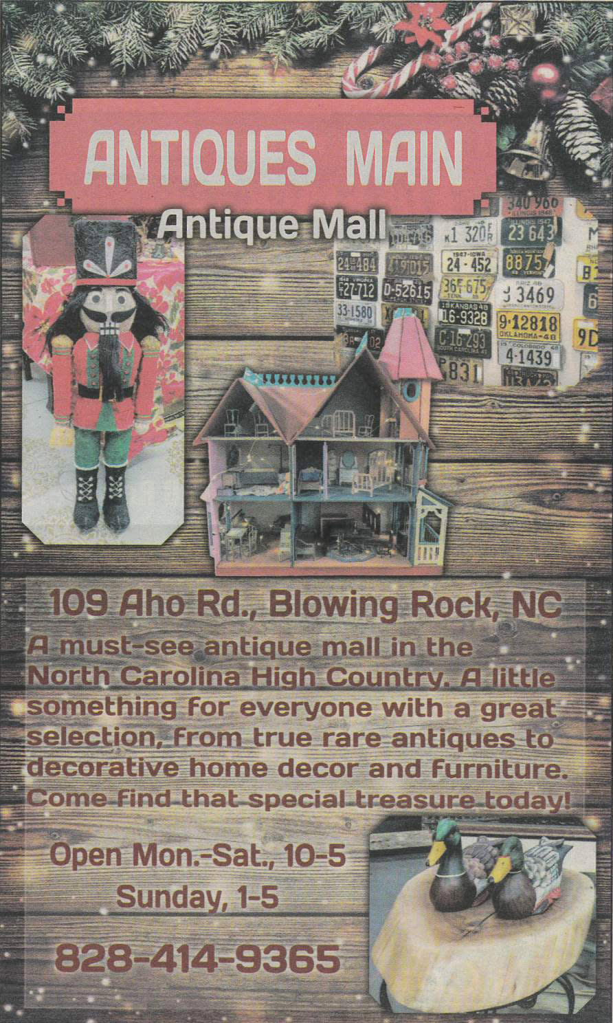 Antiques Main is an Antique Mall with 50+ vendors with an eclectic selection. Items include rare antiques, vintage furniture and home décor. Vendors replenish their spaces as needed. We re heding into our 8th year of operation in the High Country. Located off of Aho Road in Blowing Rock. Open Monday-Saturday, 10-5pm and Sunday, 1-5pm. 828-414-9365